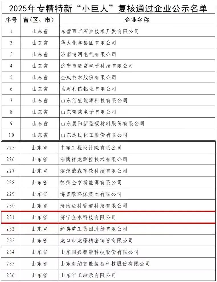 近日,山東省工業(yè)和信息化廳公示了第七批專(zhuān)精特新 “小巨人”企業(yè)及 2025年復(fù)核通過(guò)企業(yè)名單,濟(jì)寧金水科技有限公司憑借其在智能計(jì)量領(lǐng)域的突出表現(xiàn),順利通過(guò)復(fù)核工作。